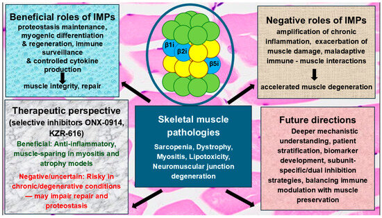 Findings discussed in the section above suggest that while the standard proteasome is responsible for degrading myofibrillar proteins during muscle atrophy [137], IMPs may play a role in regulating the inflammatory crosstalk between muscle cells and infiltrating immune cells. Maladaptive immune activation in skeletal muscle pathologies may therefore be exacerbated by IMP-mediated cytokine production and antigen presentation, establishing a vicious cycle of inflammation and muscle wasting [5]. However, IMPs may also protect aged muscle by maintaining proteostasis and supporting myogenesis, particularly during regeneration [25]. Thus, the impact of IMPs in skeletal muscle pathologies appears to be context dependent; they may be protective when facilitating muscle differentiation and protein quality control but detrimental when driving chronic inflammation. This dual role makes them a promising, yet potentially risky, therapeutic target in skeletal muscle pathologies, depending on the timing, disease stage, and balance between proteostatic maintenance and immune activation. This duality raises an important, yet unresolved, question about the rationale for using IMP inhibitors in skeletal muscle pathologies. In other words, “To use or not to use IMP inhibitors in skeletal muscle pathologies—that is the question”.
