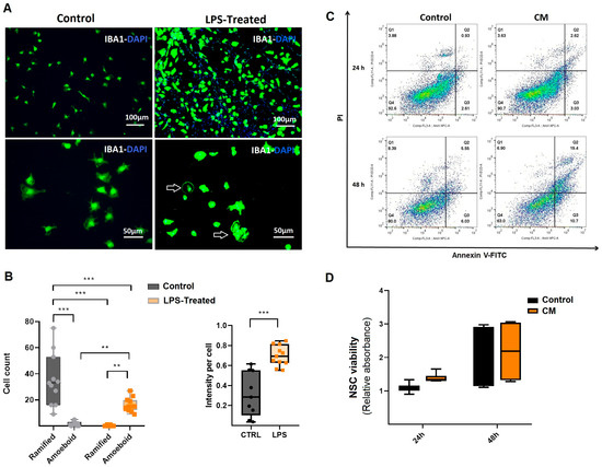 Evaluation of conditioned medium derived from microglial cells. (A) Morphology and characterization of activated microglial cells. Microglial characterization was performed using the IBA1 antibody. Amoeboid-shaped cells indicated microglial activation in response to LPS treatment. Images are shown at different magnifications. (B) Compared to the ramified (non-activated) microglia in the control group, LPS exposure significantly increased both fluorescence intensity and the proportion of amoeboid microglia (n = 3). (C) A single flow cytometry analysis of three various NSCs treated with conditioned medium from LPS-activated microglia (CM) for 24 and 48 h. Apoptosis was assessed using Annexin-PI double staining, with untreated NSCs as the control group. Our findings showed that early apoptosis increased in CM-treated NSCs after 48 h. (D) WST viability assay of NSCs treated with CM. Results indicated that CM treatment did not induce cytotoxic effects in NSCs compared to the control groups (n = 3). ** p ≤ 0.01; *** p ≤ 0.001.