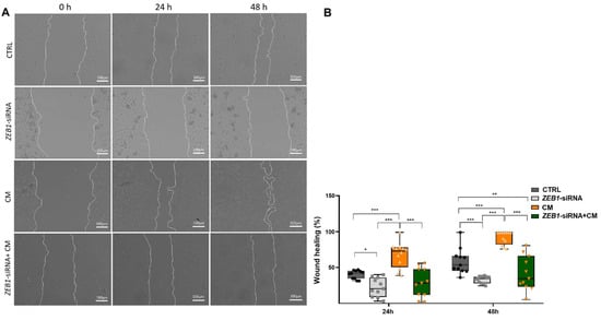 NSC migration is a fundamental process in brain development and repair, ensuring proper neuronal positioning and the potential for regeneration following injury [28]. Our results revealed that treatment with CM alone significantly accelerated wound closure compared to other groups at both 24 and 48 h (p ≤ 0.001; Figure 5A,B). Conversely, NSCs treated with ZEB1-siRNA exhibited a significantly reduced migration rate compared to the control group at 24 h (p ≤ 0.05) and 48 h (p ≤ 0.001) (Figure 5A,B). The ZEB1-siRNA + CM group exhibited a significantly lower wound closure rate than the control group only after 48 h (p ≤ 0.01; Figure 5A,B). These findings point to the role of ZEB1 in regulating NSC migration, suggesting its potential involvement in neural repair and regeneration.