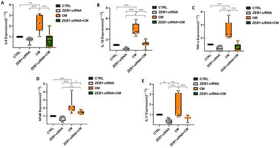 Impact of ZEB1 silencing on cytokine expression in NSCs. The expression levels of IL-6 (A), IL-1β (B), TNF-α (C), NFκB (D), and IL-17 (E) were analyzed using qPCR (n = 5). Application of CM resulted in the enhancement of all cytokines compared to the control group. ZEB1 silencing resulted in a significant decrease in the expression of these inflammatory cytokines in the ZEB1-siRNA + CM group, indicating that ZEB1 plays a critical role in regulating neuroinflammation. The control group serves as the baseline reference, with its relative expression value normalized to 1. * p ≤ 0.05, ** p ≤ 0.01, and *** p ≤ 0.001.