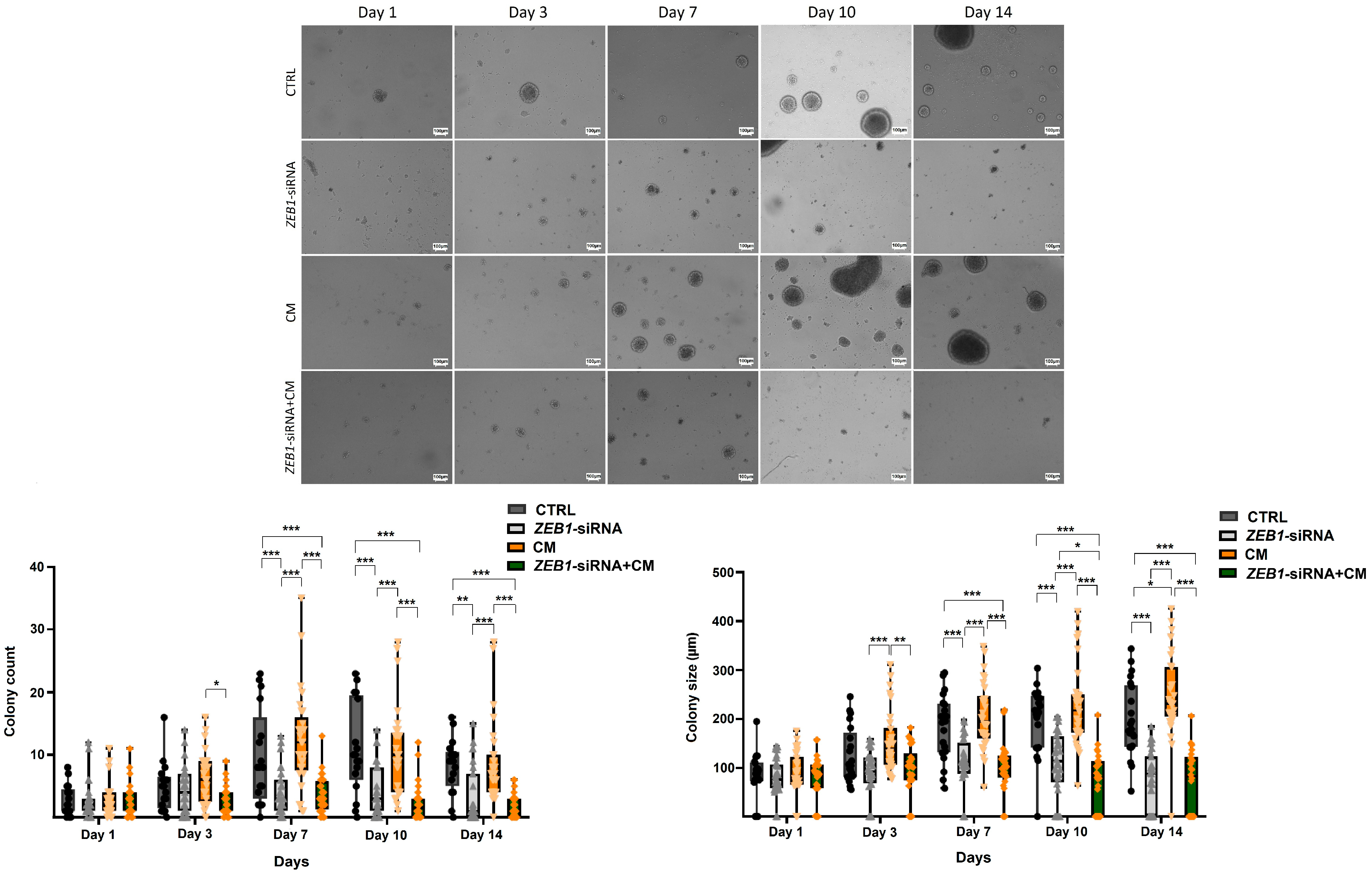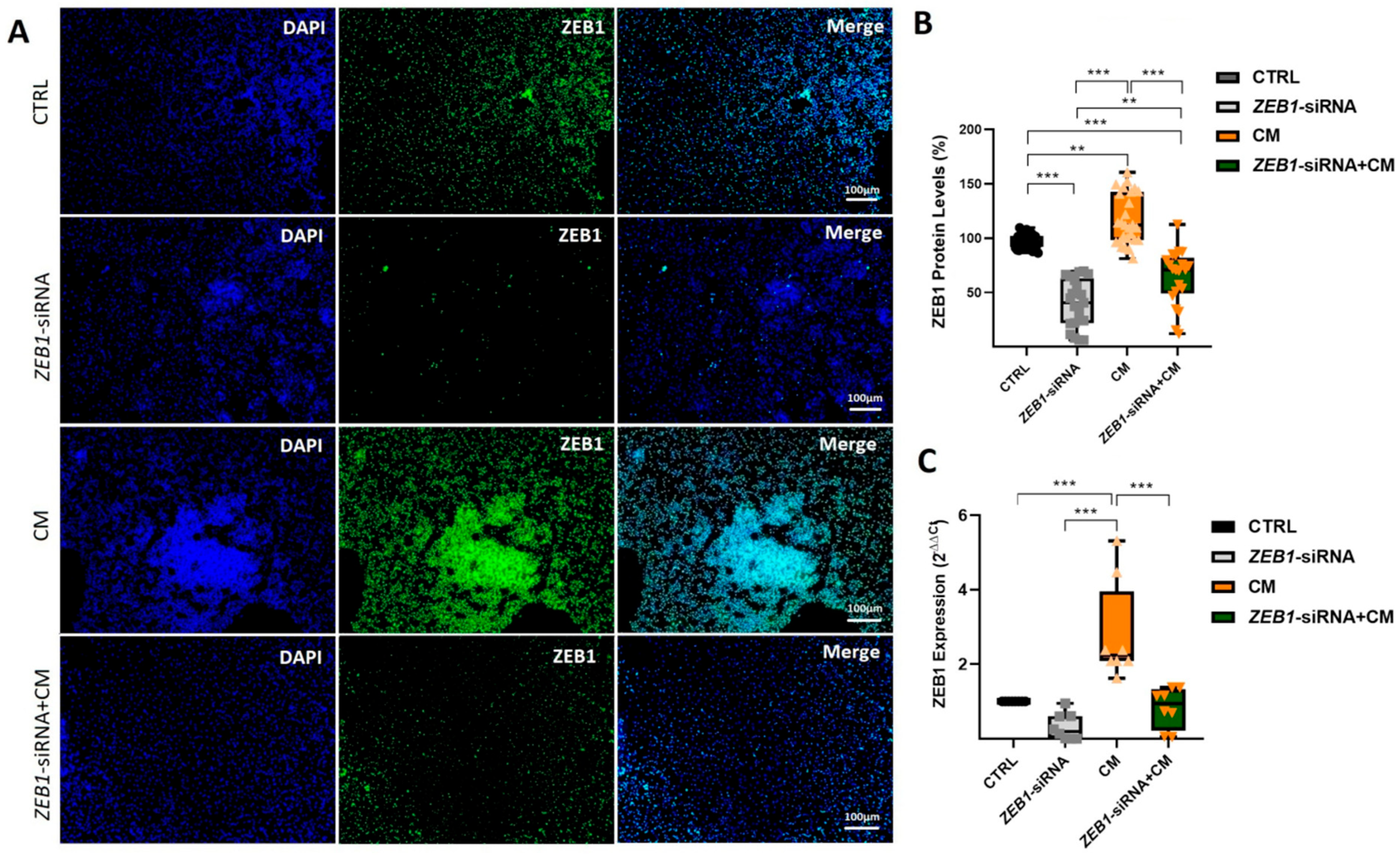 The ZEB1 gene knockdown was carried out through the utilization of ZEB1 siRNA was delivered by Lipofectamine® 2000 (see M+M section). The study included four experimental groups: (i) a non-treated control group, (ii) a group with ZEB1 gene silencing using specific siRNA (ZEB1-siRNA), (iii) a group treated with CM, and (iv) a group treated with both ZEB1-siRNA and CM (ZEB1-siRNA + CM).
