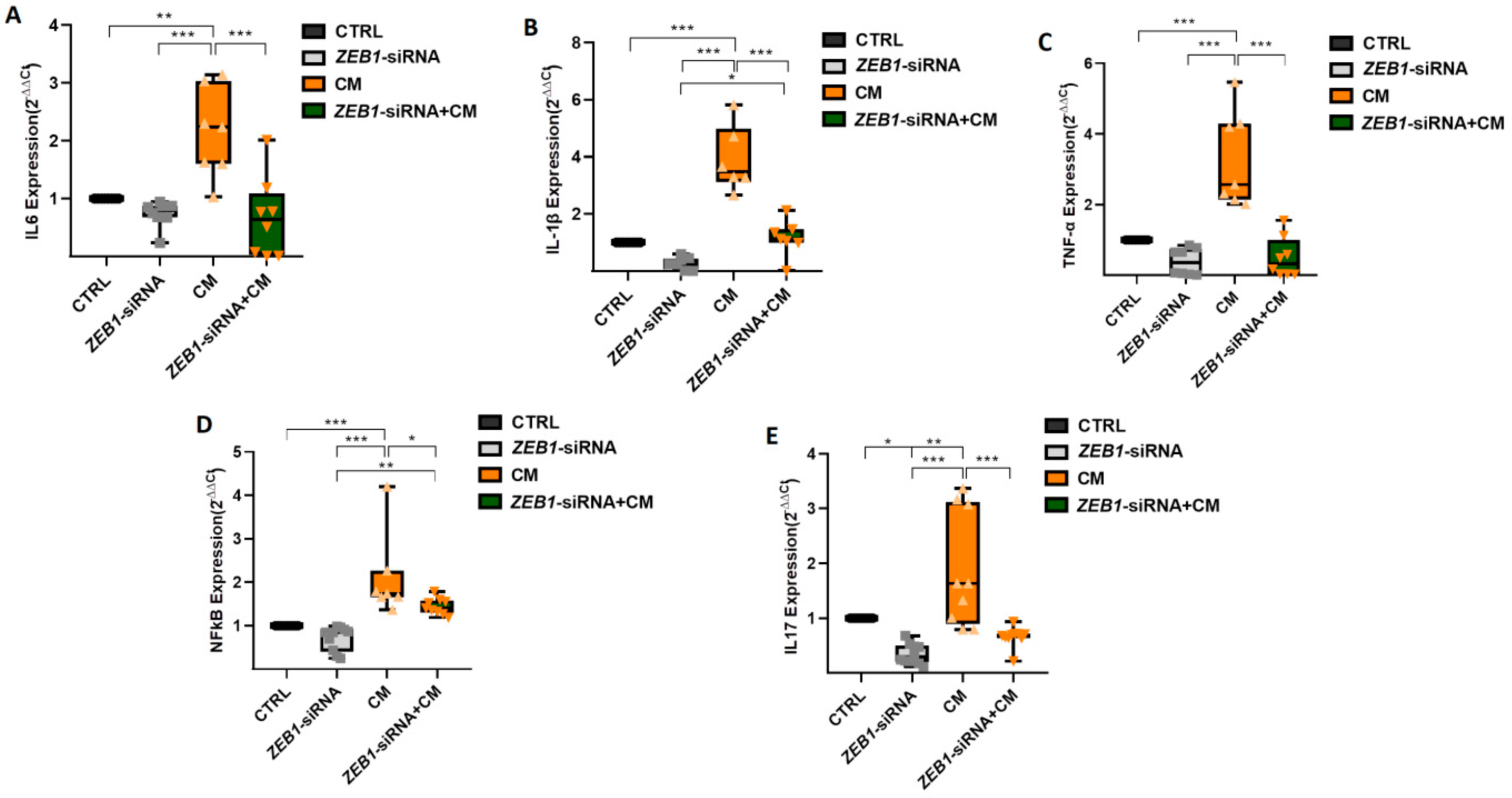 Figure 6. Impact of ZEB1 silencing on cytokine expression in NSCs. The expression levels of IL-6 (A), IL-1β (B), TNF-α (C), NFκB (D), and IL-17 (E) were analyzed using qPCR (n = 5). Application of CM resulted in the enhancement of all cytokines compared to the control group. ZEB1 silencing resulted in a significant decrease in the expression of these inflammatory cytokines in the ZEB1-siRNA + CM group, indicating that ZEB1 plays a critical role in regulating neuroinflammation. The control group serves as the baseline reference, with its relative expression value normalized to 1. * p ≤ 0.05, ** p ≤ 0.01, and *** p ≤ 0.001.