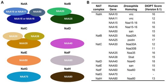 NAT complexes and their components. (A) Schematic representation of eight different NAT complexes. NAA10, NAA11, NAA20, NAA30, NAA40, NAA50, NAA60, NAA70, and NAA80 are the catalytic enzymes in each complex. (B) Human and Drosophila NAT complexes and their subunits. DIOPT, DRSC integrative ortholog prediction tool (version 9.1; max score Drosophila-human is 19).