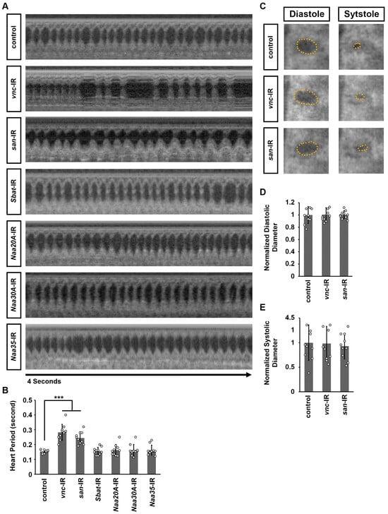 To access cardiac functional defects resulting from vnc or san silencing, we employed optical coherence tomography (OCT), which serves as the Drosophila equivalent of echocardiography in humans [,]. The orthogonal view provided by OCT enables real-time measurements of heart tube diameter and heart period (Figure 3A). Because heart-specific silence Naa15-16 led to a complete loss of the heart structure in adult Drosophila, no cardiac signals could be detected using OCT. We observed that silencing vnc or san significantly increased the heart period compared to control flies (Figure 3B), but did not alter the systolic or diastolic diameters (Figure 3C–E). In contrast, silencing other NAT complex components did not produce any notable morphological or functional heart defects (Figure 2 and Figure 3).