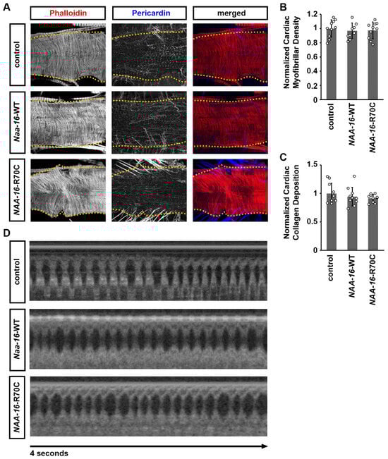 To further validate the function of the NAA16 variant identified in the CHD patients, we performed rescue experiments in Drosophila using the gene replacement strategy we developed previously [,,,,] (Figure 5A). First, we assessed the functional conservation between Drosophila Naa15-16 and human NAA16 to establish a platform for variant validation. Cardiac-specific expression of wild-type human NAA16 in the Naa15-16 silenced Drosophila completely rescued the morphological and functional cardiac defects, confirming their conserved function (Figure 5). In contrast, the NAA16 R70C variant failed to restore the normal cardiac morphology (Figure 5B). Because heart-specific silencing of NAA15-16 resulted in a complete loss of cardiac structure in adult Drosophila, no cardiac signals could be detected by OCT in Drosophila with NAA15-16 silencing or those together with expressing the NAA16 R70C variant. These results suggest that the R70C variant functions as a hypomorphic allele, exhibiting partial loss of activity that is insufficient to sustain normal cardiac development in the absence of endogenous Naa15-16.
