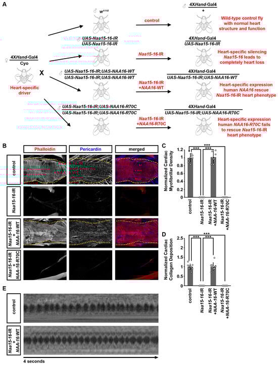Defects caused by Drosophila NAA15-16 silencing can be rescued by wild-type human NAA16, but not the CHD-associated variant. (A) Schematic representation of the “Gene Replacement” strategy used to rescue the heart phenotype caused by heart-specific silencing of Drosophila NAA15-16, using human wild-type NAA16 and the disease-associated variant R70C. (B) Representative confocal images of adult (4-day-old females) Drosophila hearts UAS-RNAi transgenes targeting NAA15-16 (4XHand-Gal4), and together with human wildtype NAA16 or its CHD-associated variant. Cardiac actin myofibers were visualized by phalloidin staining (red). Pericardin was detected by immunofluorescence (blue). Dotted lines indicated the boundaries of the heart tube. Control, 4XHand-Gal4+/−. (C) Quantitation of adult heart cardiac myofibrillar density relative to control (see image in (A)) [mean ± s.d.; n = 10 flies (4-day-old females) per genotype; Kruskal–Wallis H-test followed by a Dunn’s test; statistical significance: *** p < 0.001]. (D) Quantitation of adult heart cardiac collagen (Pericardin) deposition relative to control (see images in (A)) [mean ± s.d.; n = 10 flies (4-day-old females) per genotype; Kruskal–Wallis H-test followed by a Dunn’s test; statistical significance: *** p < 0.001]. (E) Representative OCT images from heartbeat recording of Drosophila (4-day-old females) expressing UAS-RNAi transgenes targeting NAA15-16 (4XHand-Gal4), and together with human wildtype NAA16 or its CHD-associated variant. Control, 4XHand-Gal4+/−.