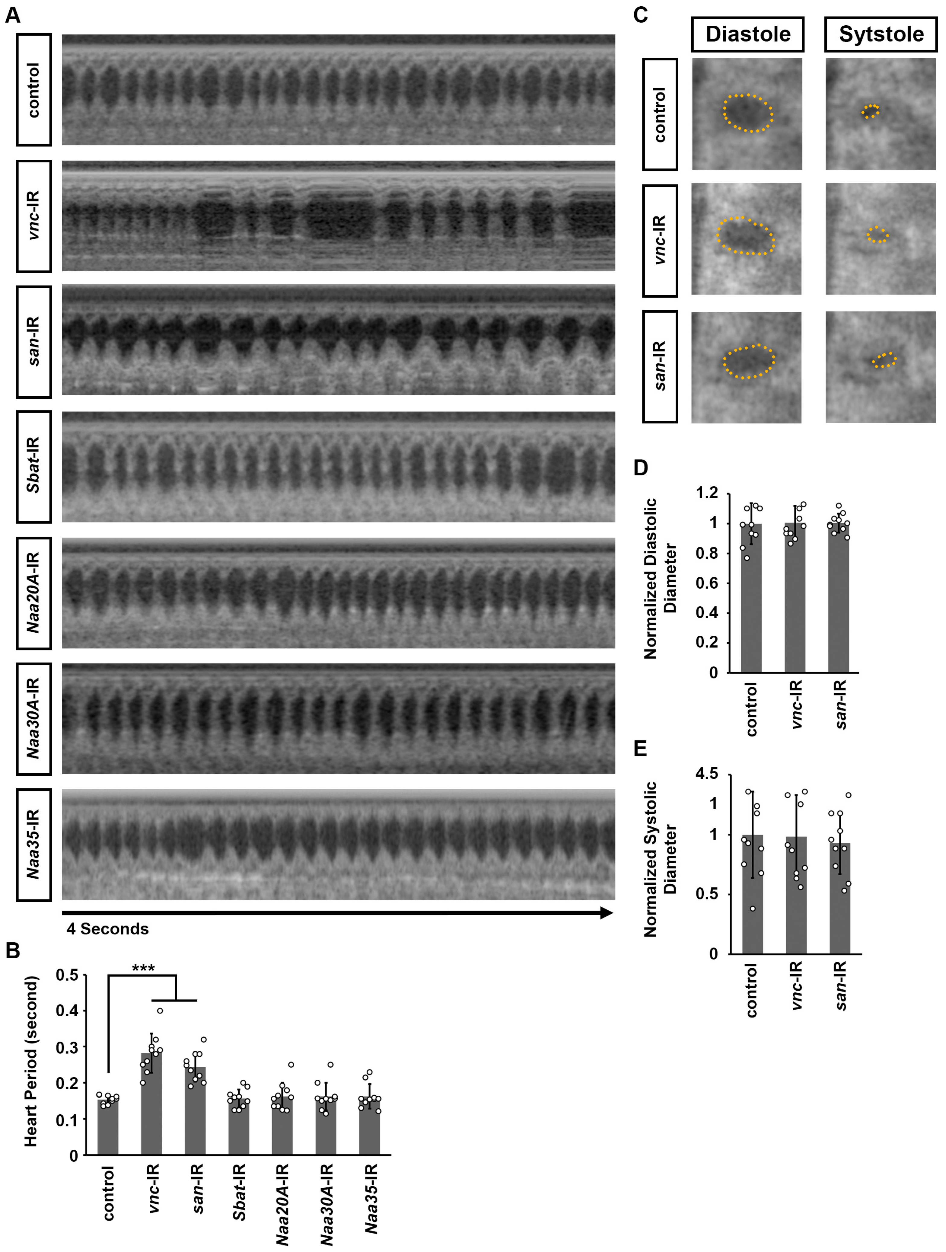 2.2. Silencing NatA Complex Components Naa15-16, Vnc, or San Induced Cardiac Structural and Functional Defects in Adult Drosophila