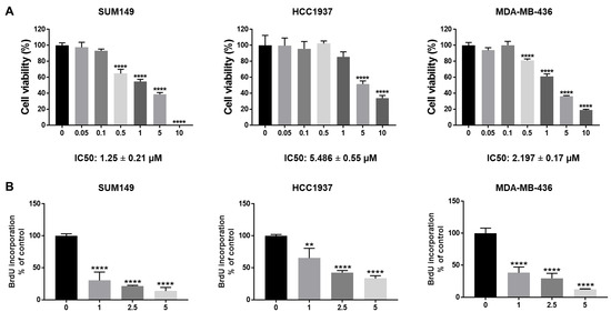 To test the efficacy of abemaciclib in BRCA1-mutant TNBC cells, we treated SUM149, HCC1937, and MDA-MB-436 cells with different dosages of abemaciclib (0.05–10 µM). MTT assay results showed that abemaciclib inhibited cell viability in all three BRCA1-mutant TNBC cell lines in a dose-dependent manner (Figure 1A). The IC50 of abemaciclib in SUM149, HCC1937, and MDA-MB-436 cells is 1.25 ± 0.21 µM, 5.486 ± 0.55 µM, and 2.197 ± 0.17 µM separately (Figure 1A). In addition, we examined the effects of abemaciclib on cell proliferation of BRCA1-mutant TNBC cells using a BrdU cell proliferation assay. As shown in Figure 1B, abemaciclib treatment significantly reduced BrdU incorporation compared to DMSO-treated cells. Overall, these results indicate that abemaciclib can inhibit cell viability and proliferation of BRCA1-mutant TNBC cells.