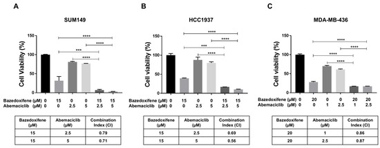 To investigate the synergistic inhibitory effects of bazedoxifene and abemaciclib on BRCA1-mutant TNBC cells, SUM149, HCC1937, and MDA-MB-436 cells were treated with bazedoxifene, abemaciclib, or a combination of both for 72 h. Cell viability following treatment was assessed using the MTT assay and the CI was calculated. As shown in Figure 3, treatment with either bazedoxifene or abemaciclib alone reduced cell viability across all BRCA1-mutant TNBC cell lines. However, the combination treatment resulted in significantly greater inhibition of cell viability compared to monotherapy. Additionally, the CI values for the combination at both concentrations of abemaciclib were found to be less than 1.0 in all tested cell lines (Figure 3A, table), indicating a synergistic effect. Together, these results indicate that dual inhibition of the IL-6/STAT3 pathway and CDK4/6 synergistically suppresses the growth of BRCA1-mutant TNBC cells.