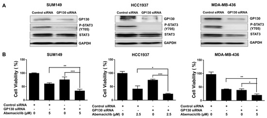 Human glycoprotein 130 (GP130) siRNA and control siRNA were purchased from Santa Cruz Biotechnology (Dallas, TX, USA). Cells were seeded into 96-well plates at a density of 3000 cells/well and transfected with human GP130 siRNA and control siRNA using lipofectamine™ RNAiMAX transfection reagent (Invitrogen, Waltham, MA, USA) according to the manufacturer’s instructions. After 48 h transfection, cells were treated with abemaciclib for an additional 72 h and we proceeded with an MTT assay.