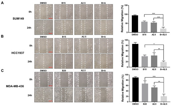 Significant inhibitory effects of bazedoxifene and abemaciclib combination on the migration of BRCA1-mutant TNBC cells. Wound healing assay was performed to evaluate cell migration in SUM149 (A), HCC1937 (B), and MDA-MB-436 (C) cells with bazedoxifene alone, abemaciclib alone, and the combination treatment for 24 h. Representative images of scratches with bazedoxifene alone (B15: 15 μM bazedoxifene; B20: 20 μM bazedoxifene), abemaciclib alone (A2.5: 2.5 μM abemaciclib), and the bazedoxifene and abemaciclib (B+A) combination treatment. The scale bar is 20 µM. The statistical analysis of cell invasion was shown in the right panel. Relative migration was quantified by measuring the wound area and statistical analysis was performed on data from triplicate assays. * p < 0.05, ** p < 0.01, and *** p < 0.001.
