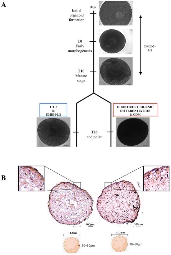 Generation of organoids. (A) From T0 to T26 end point. Representative images of development of organoids maintained in DMEM-LG (CTR) and organoids undergoing odonto/osteogenic differentiation (ODONTO/OSTEO) acquired using the optical Leica Mateo TL microscope (Magnify 4×). The scales correspond to 200 μm. (B) Representative images of the hematoxylin and eosin staining of the CTR and ODONTO/OSTEO organoids acquired using the optical Leica Mateo TL microscope (Magnify 10×). The scale correspond to 100 μm.
