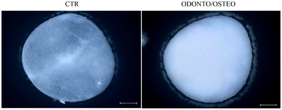 Organoids of the control (CTR) and differentiated (ODONTO/OSTEO) derived from DPSCs were observed by the stereo Zeiss Axio Zoom.v16 microscope (Zeiss, Oberkochen, Germany). Figure 3 shows that CTR organoids exhibited a regular spherical morphology with a smooth, translucent, and homogeneous surface. No macroscopic evidence of mineralization was observed. Conversely, ODONTO/OSTEO organoids displayed a more irregular surface and a more opaque and white appearance (Figure 3).