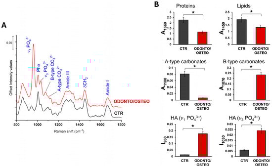 Raman microspectroscopy analysis of CTR and ODONTO/OSTEO organoids. (A) Average Raman spectra representative of CTR and ODONTO/OSTEO experimental groups. Labels highlight the peaks of interest; for better viewing, spectra are offset along the y-axis. (B) Statistical analysis of the numerical variation in proteins, lipids, A-type carbonates, B-type carbonates, and HA (ν1 and ν3) calculated values. Three specimens (n = 3) were analysed from each group, with ten spectra obtained from each specimen. Data are presented as mean ± SD. * Statistically significant value of ODONTO/OSTEO box charts with respect to CTR (p < 0.05; Student’s t-test).