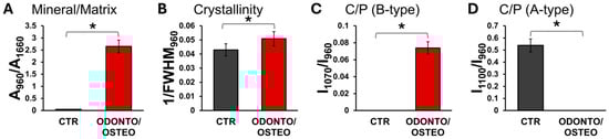 In addition, the three widely employed spectral markers mineral/matrix (A960/A1660), crystallinity (1/FWHM960), and C/P (carbonates/phosphates, I1070/I960) were calculated and compared between CTR and ODONTO/OSTEO (Figure 6).
