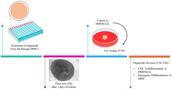 Representative schematic steps for organoid growth. Following the generation of organoids, after three days, adequate cell aggregation was observed, leading us to consider this as our time zero (T0). After 10 days (T10) of culture, the organoids were divided into two groups: undifferentiated, maintained in DMEM-LG into the 96-well U-bottom, and the other group subjected to osteogenic differentiation with specific culture medium (ODM) from T10 to T26.