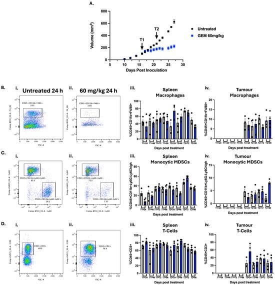 The temporal immune profile of gemcitabine in 4T1 tumour-bearing mice: 5 × 104 4T1 cells were inoculated into the 4th mammary fat pad of female Balb/C mice (Day 0). Mice were treated twice with 60 mg/kg GEM on Days 16 (Treatment1 (T1)) and 21 (Treatment2 (T2)) after cell inoculation. (A) Tumour growth was monitored throughout the study. Tumours and spleen were collected 24-96 h after treatment 1 and 2 (T1/2 + 24/48/72/96) and analysed via flow cytometry. Representative gating of (B) macrophages (CD45+CD11b+F4/80+), (C) monocytic myeloid-derived suppressor cells (M-MDSCs; CD45+CD11b+Ly6G−Ly6C+) and (D) T-cells (CD45+CD3+) in spleen following (i) saline or (ii) gemcitabine treatment, with quantification of macrophage abundance in the (iii) spleen and (iv) tumour over time.