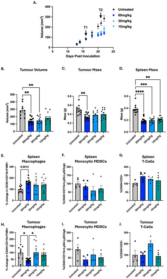 All three dosages were able to reduce tumour volume and mass in a similar manner; however, 15 mg/kg appears to be slightly less effective (Figure 2A–C). Next, the impact on immune populations was interrogated with changes observed in the T-cell, MDSC and macrophage populations as before (Figure 2E–J). Sixty mg/kg was the only dose that significantly decreased tumour macrophages (p = 0.0177), with a reduction of ~50% (Figure 2H). While all three dosages did not statistically significantly decrease M-MDSCs or increase T-cells, a trend is seen and could become significant with a larger sample size (as noted in our final combined analysis (Figure 4)).