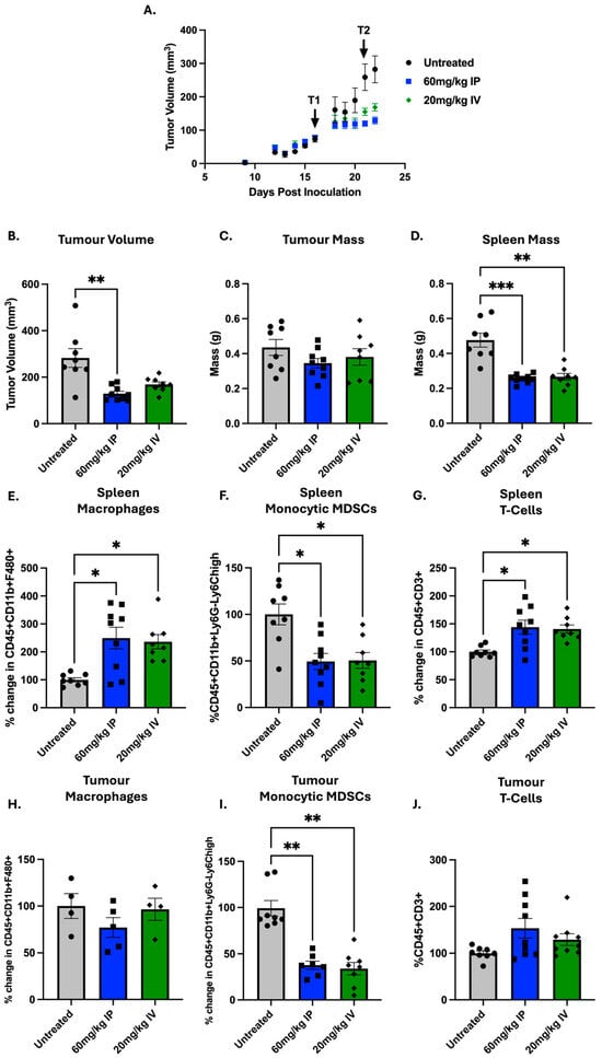 Both I.P. and I.V. reduced tumour volume to a similar extent; however, only 60 mg/kg saw a statistically significant reduction in volume (p = 0.0011), while neither saw a significant reduction in tumour mass. Both I.P. and I.V. significantly reduced spleen mass in comparison to untreated tumours (p = 0.0008 and 0.0050, respectively), which again correlates with a reduced tumour burden and a change in immune populations. A significant increase in splenic macrophages was seen in both I.P. (p = 0.0014) and I.V. (p = 0.0117) treatments in comparison to untreated tumours. However, while no significant changes in tumour macrophages were seen, there was a slight decrease observed in the I.P. treatment group. Both I.P. and I.V. groups significantly decreased splenic (p = 0.0234 and 0.0197, respectively) and tumour (p = 0.0048 and p = 0.0014, respectively) M-MDSCS, compared to the untreated group. In comparison to the untreated group, both I.P. and I.V. groups also significantly increased splenic T-cells (p = 0.01019, p = 0.0123, respectively) and increased tumour T-cells, although statistically insignificant.
