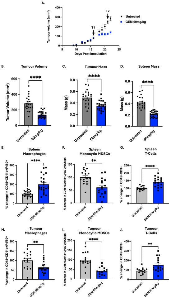 The immune profile of gemcitabine: 5 × 104 4T1 cells were inoculated into the fourth mammary fat pad of female BALB/c mice (Day 0). Mice were treated intraperitoneally with gemcitabine (GEM; 60 mg/kg) on Days 16 (Treatment1 (T1)) and 21 (Treatment1 (T2)). Five independent experiments were performed. Results were normalised within each experiment to untreated mice and subsequently combined. (A) Tumour growth was monitored throughout the study with (B) final tumour volumes compared on Day 22. Tumours and spleens were harvested 24 h after the second treatment (Day 22). (C) Tumour and (D) spleen mass were measured. Flow cytometry was used to quantify immune populations in the (E–G) spleen and (H–J) tumour, including macrophages (CD45+CD11b+F4/80+), monocytic MDSCs (CD45+CD11b+Ly6G−Ly6Chigh) and T-cells (CD45+CD3+). Data are shown as mean ± SEM, with each point representing an individual mouse. The ROUT outlier test was applied (Q = 10%) and statistical significance was assessed using nonparametric unpaired Mann–Whitney U-test ** p < 0.01, **** p < 0.0001.