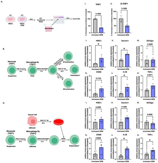 Gemcitabine-induced macrophage recruitment and polarisation: (A) 4T1 cells were treated with GEM (100 nM) for 48 h. (i) THP-1 monocytes (ii) differentiated D-THP-1 macrophages chemotaxis across a transwell towards the 4T1-conditioned media which was measured at 72 h. Data are presented as the percentage of migrated cells compared to the untreated control. (B) Differentiated macrophages (D-THP-1) were treated with GEM (100 nM) for 24 h or (C) conditioned media from 4T1 cells treated with GEM (100 nM) or control for 48hr. Gene expression of M1 and M2 polarisation markers was measured by qPCR. The graphs show the relative mRNA expression of M2 markers MRC1 (i), Dectin1 (ii) and DCSign (iii), and M1 markers CD80 (iv), IL1B (v) and TNFα (vi). Data are normalised to the untreated control. Data are shown as mean ± SEM, with each point representing an individual replicate. The ROUT outlier test was applied (Q = 10%) and statistical significance was assessed using nonparametric unpaired Mann–Whitney U-test: * p < 0.05.