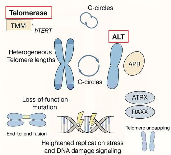 ALT is based on homologous recombination-mediated DNA synthesis, in which telomeric sequences are copied from sister chromatids or other telomeric templates (Figure 1). Hallmarks of ALT-positive cells include highly heterogeneous telomere lengths, extrachromosomal telomeric DNA circles (C-circles), and the presence of ALT-associated promyelocytic leukemia (PML) nuclear bodies (APBs), which serve as hubs for telomere recombination and repair [5]. ALT activation is strongly correlated with loss-of-function mutations in chromatin remodeling factors such as ATRX and DAXX [6,7,8], and often coexists with heightened replication stress and DNA damage signaling. From a clinical standpoint, ALT has traditionally been considered an adverse biomarker [9]. In aggressive cancers such as osteosarcoma, pancreatic neuroendocrine tumors, and various high-grade sarcomas, ALT positivity is associated with genomic instability [7,10,11], therapy resistance, and poor patient survival. This has led to a general perception of ALT as a marker of aggressive tumor biology. Yet, paradoxically, emerging evidence reveals that ALT may confer a survival advantage in specific tumor contexts. Among the molecular subtypes of GBM, ALT activation is predominantly found in the mesenchymal and proneural types, while other subtypes may retain telomerase activity (TA) [12]. In glioblastoma multiforme (GBM) and chondrosarcoma—both of which are historically “immune-cold” tumors with limited T-cell infiltration, poor immunogenicity, and restricted therapeutic responsiveness—ALT positivity has been associated with improved patient outcomes. This observation challenges the conventional view of ALT as uniformly detrimental and raises intriguing questions about tumor-type-specific interactions between telomere biology, chromatin state, DNA repair stress, and the tumor microenvironment [13,14,15].