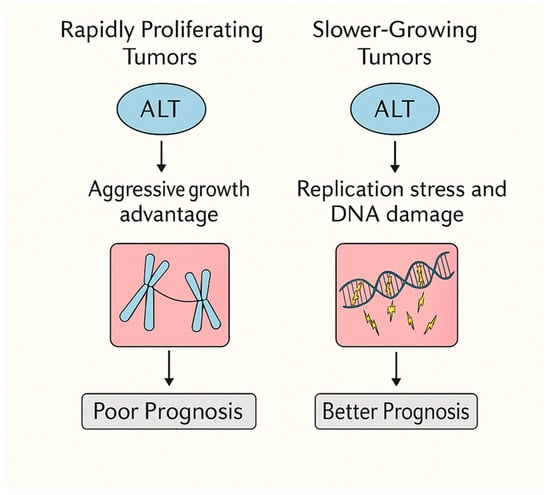 Taken together, ALT exemplifies a double-edged sword in cancer biology. In rapidly proliferating, telomerase-negative cancers, ALT sustains cellular immortality and accelerates genomic evolution, ultimately leading to poor prognosis. In contrast, in slower-growing, immune-cold tumors, ALT amplifies DNA damage and replication stress, reducing tumor fitness and resulting in a relatively better prognosis.