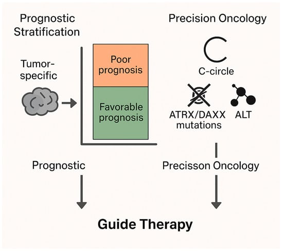 The recognition that ALT does not uniformly predict poor outcomes, but rather exerts context-dependent effects, calls for a paradigm shift in how telomere biology is integrated into oncology practice. In highly proliferative cancers such as osteosarcoma or pancreatic neuroendocrine tumors, ALT positivity should still be considered a marker of aggressive disease and unfavorable prognosis. However, in slower-growing, immune-cold tumors such as glioblastoma (GBM) and chondrosarcoma, ALT status may actually serve as a favorable prognostic indicator. This distinction emphasizes the need for tumor-type-specific interpretation of ALT biomarkers rather than a “one-size-fits-all” approach (Figure 4).