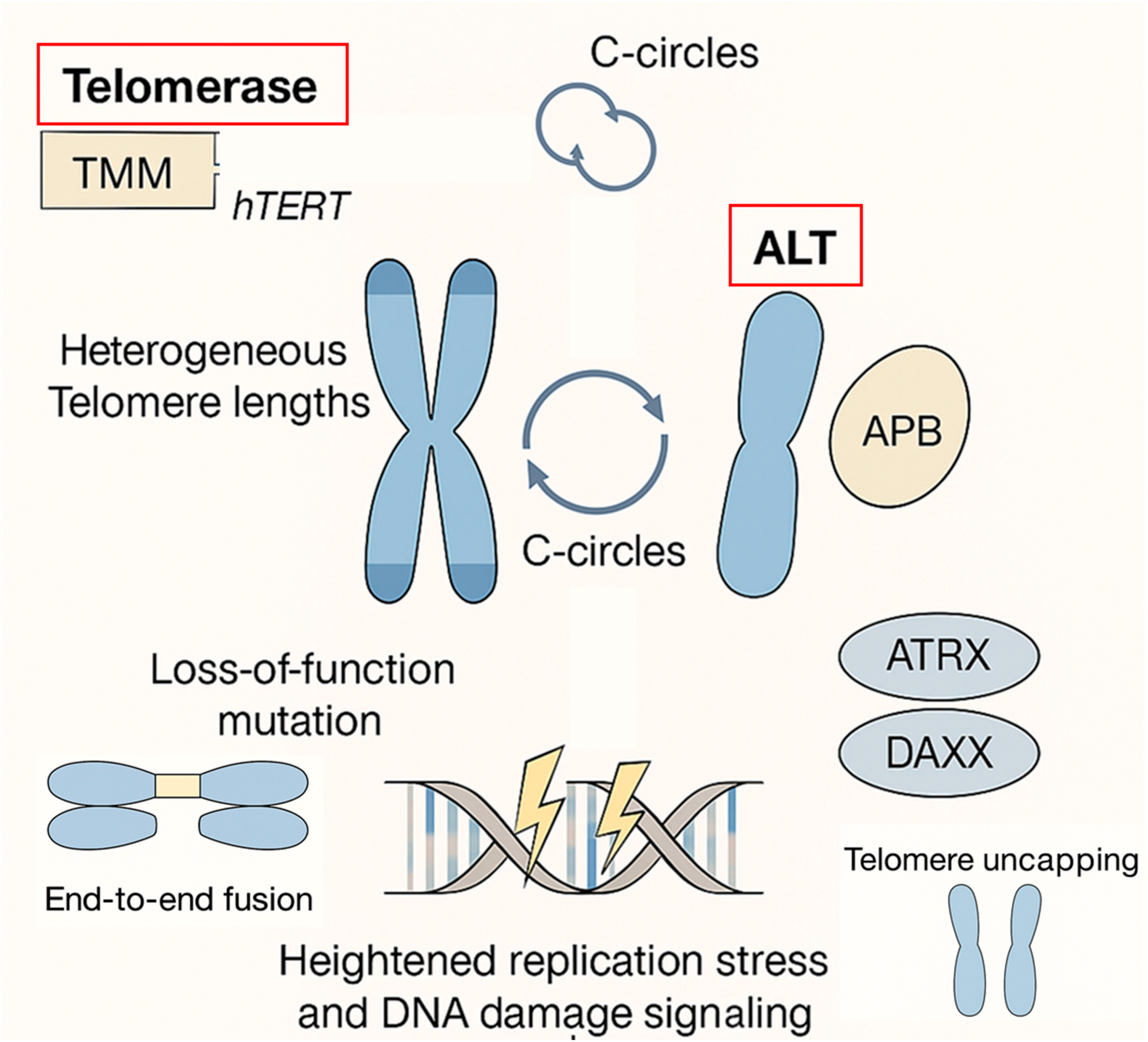 Figure 1. Mechanistic Overview of Alternative Lengthening of Telomeres (ALT). This diagram illustrates the distinct molecular features and consequences of ALT as a telomere maintenance mechanism. Unlike telomerase (hTERT)-dependent elongation, ALT operates through homologous recombination, often triggered by loss-of-function mutations in chromatin remodelers such as ATRX and DAXX. ALT-positive cells exhibit heterogeneous telomere lengths, accumulate extrachromosomal telomeric DNA circles (C-circles), and form ALT-associated promyelocytic bodies (APBs), which serve as recombination hubs. The recombination-based telomere synthesis imposes replication stress and activates persistent DNA damage signaling, contributing to genomic instability and tumor-specific vulnerabilities.