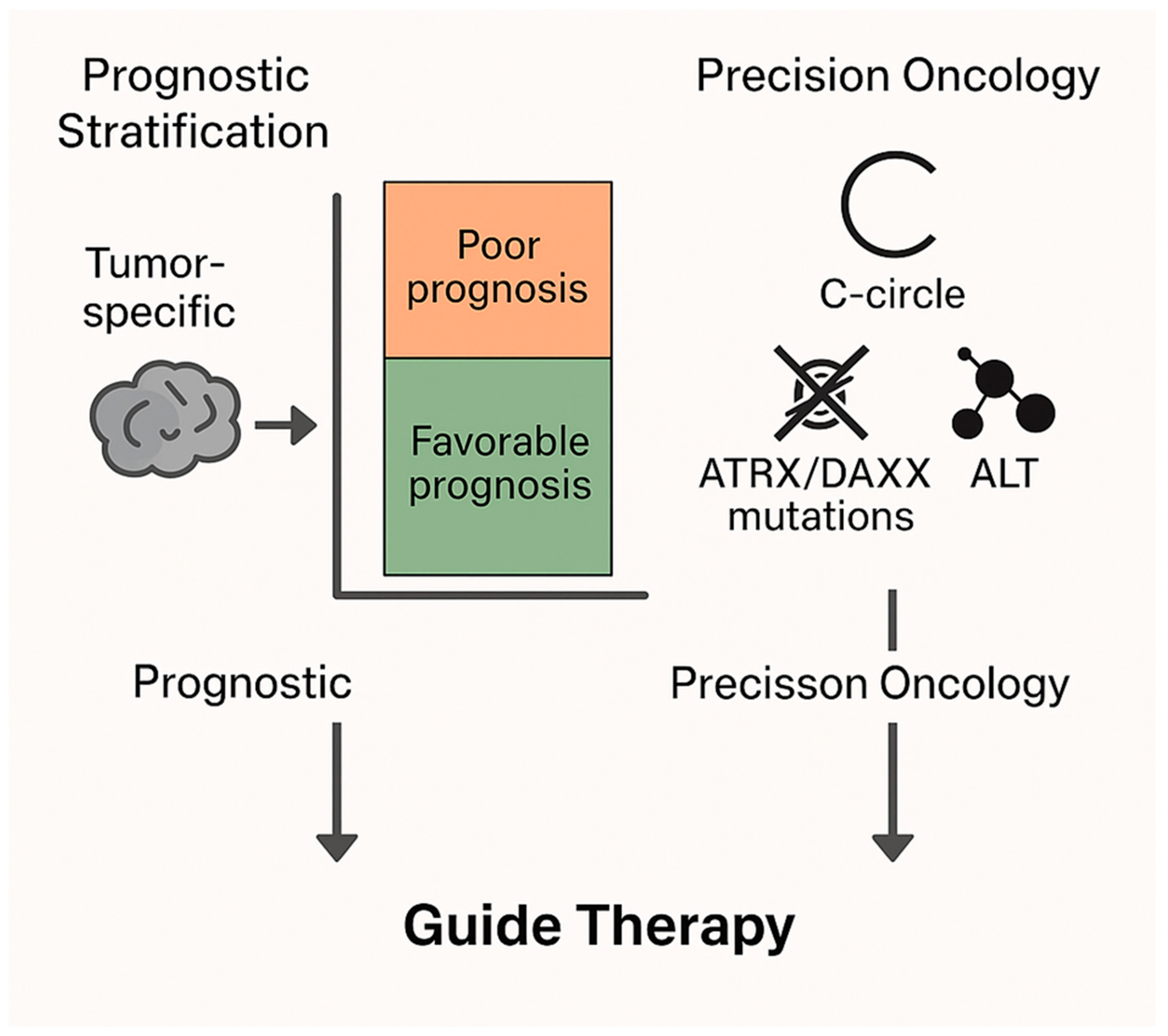 Figure 4. Clinical Utility of ALT for Prognosis and Therapy Guidance. ALT serves as a tumor-specific biomarker with dual roles: It enables prognostic stratification, predicting favorable or poor outcomes depending on cancer type. It supports precision oncology, where biomarkers such as C-circles and ATRX/DAXX mutations guide targeted therapies. ALT status can help personalize treatment decisions in cancer care.