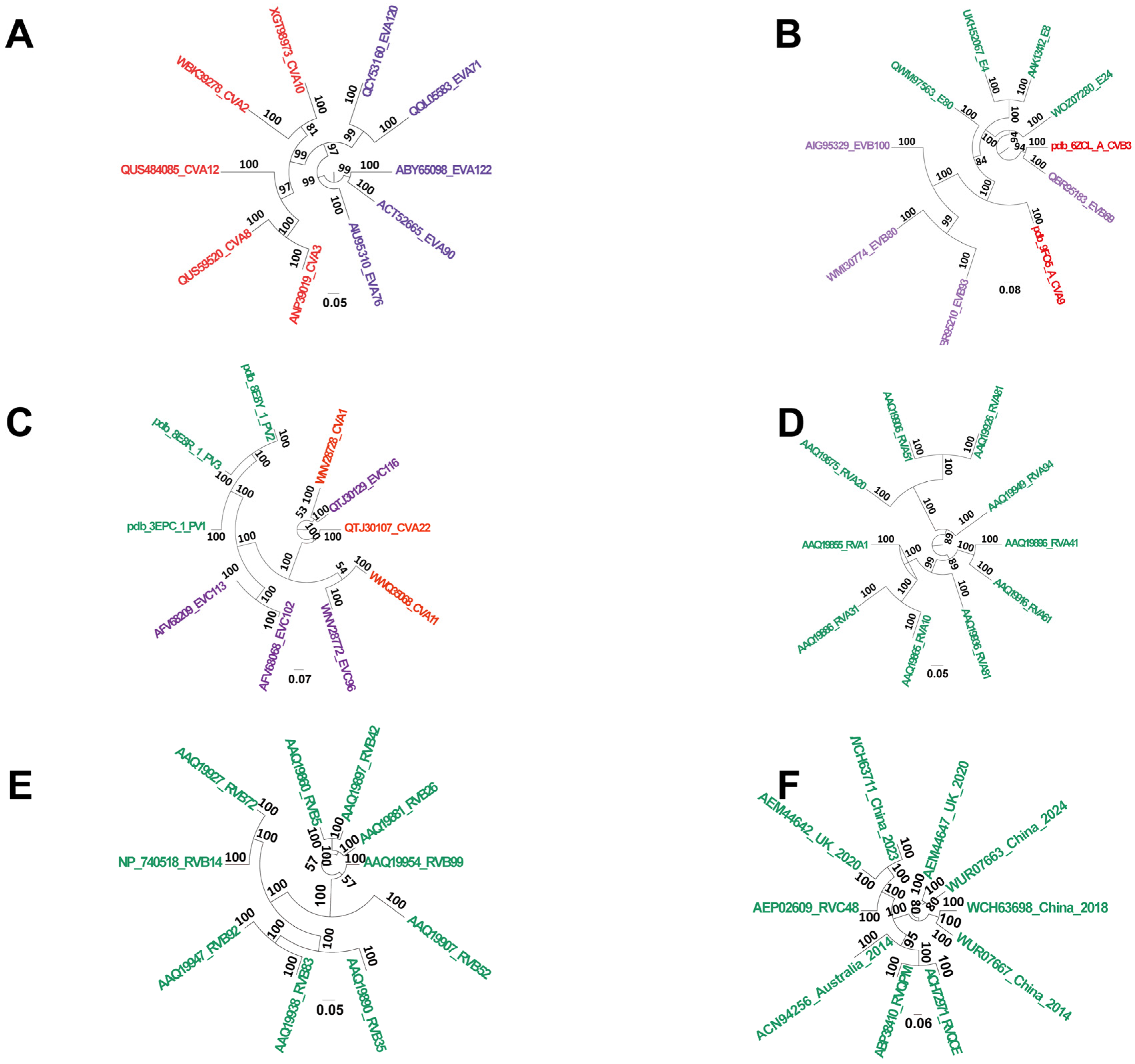 - Wang, H.; Wang, W.; Chen, G.; Hu, C.; Chen, S.; Mao, L.; Shen, H. Molecular characteristics of the structure protein VP1 in Coxsackievirus A10 Isolates from China. J. Infect. Dev. Ctries. 2024, 18, 1118–1123. [Google Scholar] [CrossRef]
