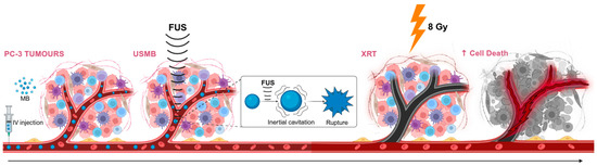Microbubbles (MBs) stimulated by focused ultrasound (FUS) have emerged as a promising radiation-enhancing modality capable of overcoming several of these limitations [13,14]. MBs are composed of gas-filled spheres, ranging between 1–10 µm in diameter, encapsulated in protective lipid, protein, or polymer shells [13,14,15,16]. Initially used as contrast agents in biomedical imaging, MBs enhance ultrasound imaging by increasing acoustic backscatter within vascular regions, facilitating real-time visualization of tissue perfusion and blood flow [13,14,15,17,18,19]. Over the past decade, MBs have been repurposed from passive imaging agents to multifunctional therapeutic carriers. Advances in MB design, including control over size, shell structure, and surface chemistry, now enable site-specific targeting, controlled drug delivery, and activation triggered by external stimuli [14,17,20,21]. When combined with FUS, MBs are acoustically stimulated (ultrasound-stimulated microbubbles; USMB) for a variety of therapeutic functions. In this context, MBs undergo either stable (rhythmic oscillation) or inertial cavitation (violent collapse), producing localized mechanical stresses on surrounding tissues and cellular structures [16,20,21,22,23]. These mechanical effects, which include fluid microstreaming, shear stress, and acoustic radiation forces, have emerged as powerful tools for enhancing therapeutic efficacy [21,22,24]. The mechanical stress generated by USMB can increase membrane permeability, disrupt endothelial junctions, and open physical barriers, such as the blood–brain barrier (BBB), thereby enabling the localized delivery of therapeutic agents that would otherwise be inaccessible [7,14,18,21,23,24,25,26].