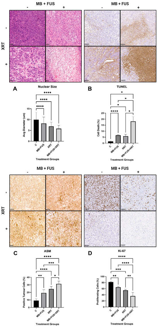 This study presents compelling histopathological and immunohistochemical evidence supporting the enhanced therapeutic efficacy of combining MB + FUS with XRT. Across multiple biomarkers, including nuclear morphology, apoptosis, proliferation, ASMase-mediated cellular stress, vascular integrity, hypoxia, and angiogenic signalling, the MB + FUS + XRT treatment group consistently demonstrated superior outcomes compared to individual therapies.