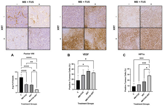 The analysis of Factor VIII staining provides direct histological evidence of treatment-induced endothelial disruption and microvessel loss [52]. Diminished Factor VIII expression reflects the structural degradation of intratumoral vasculature, most prominently in the MB + FUS + XRT group, where staining was substantially reduced. In our study, all treatment groups showed reduced Factor VIII staining compared to controls, with the most pronounced loss observed in the MB + FUS + XRT combination group, indicating a significant compromise in vascular architecture. This supports a model in which combination therapy produces a synergistic anti-vascular effect, driven by both radiation-induced apoptosis and MB + FUS-mediated mechanical injury [52].