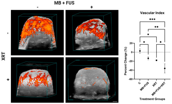 In vivo assessment of tumour perfusion using 3D Power Doppler (PD) ultrasound imaging. Left panel: Representative volumetric reconstructions of tumour vasculature (orange) are shown for each treatment group. Vascularity is visualized in a 3D overlay on B-mode grayscale anatomical images. Scale bar: 2 mm. Right panel: Average Vascular index (VI) across control (C), microbubble-enhanced focused ultrasound (MB + FUS), single-dose radiation therapy (XRT, 8 Gy), and MB + FUS + XRT treatment groups. Data are presented as mean ± SD. p-values ranging from p < 0.05 (*), p < 0.01 (**), p < 0.001 (***).