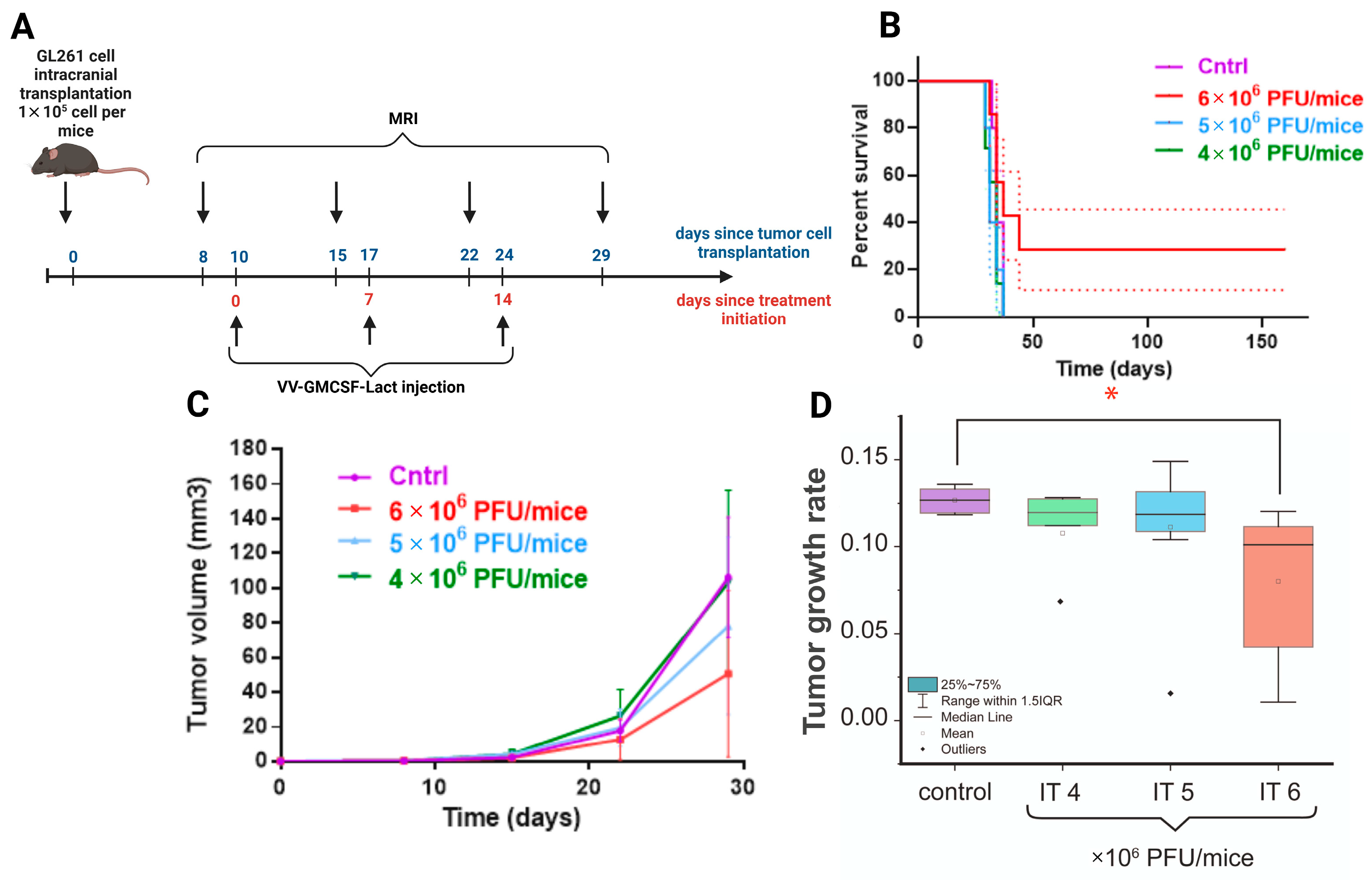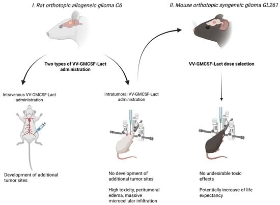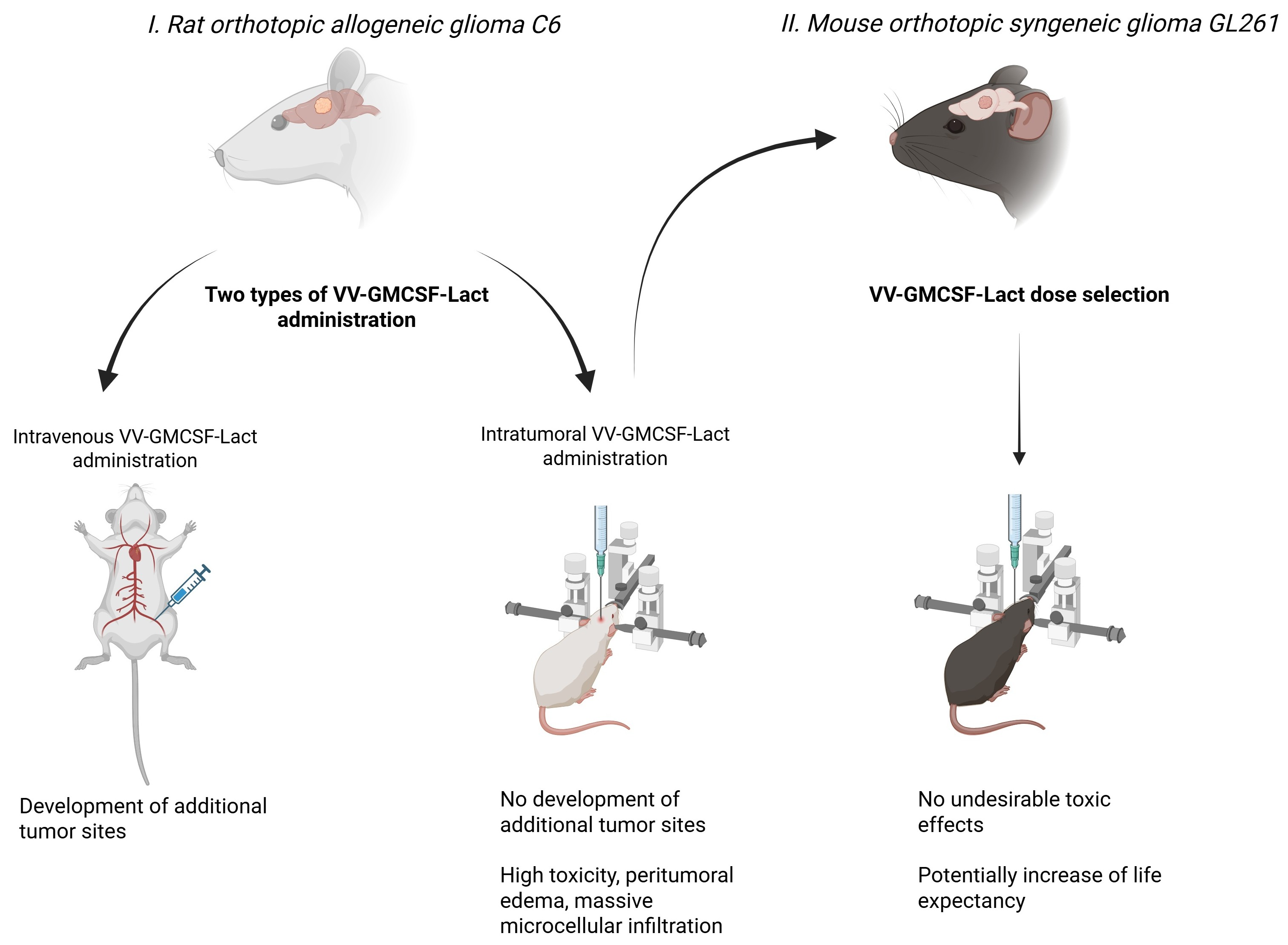 46]. The results obtained revealed an urgent need for experiments to select the dose of VV-GMCSF-Lact. This study was conducted on an immunocompetent mouse model of glioma GL261.