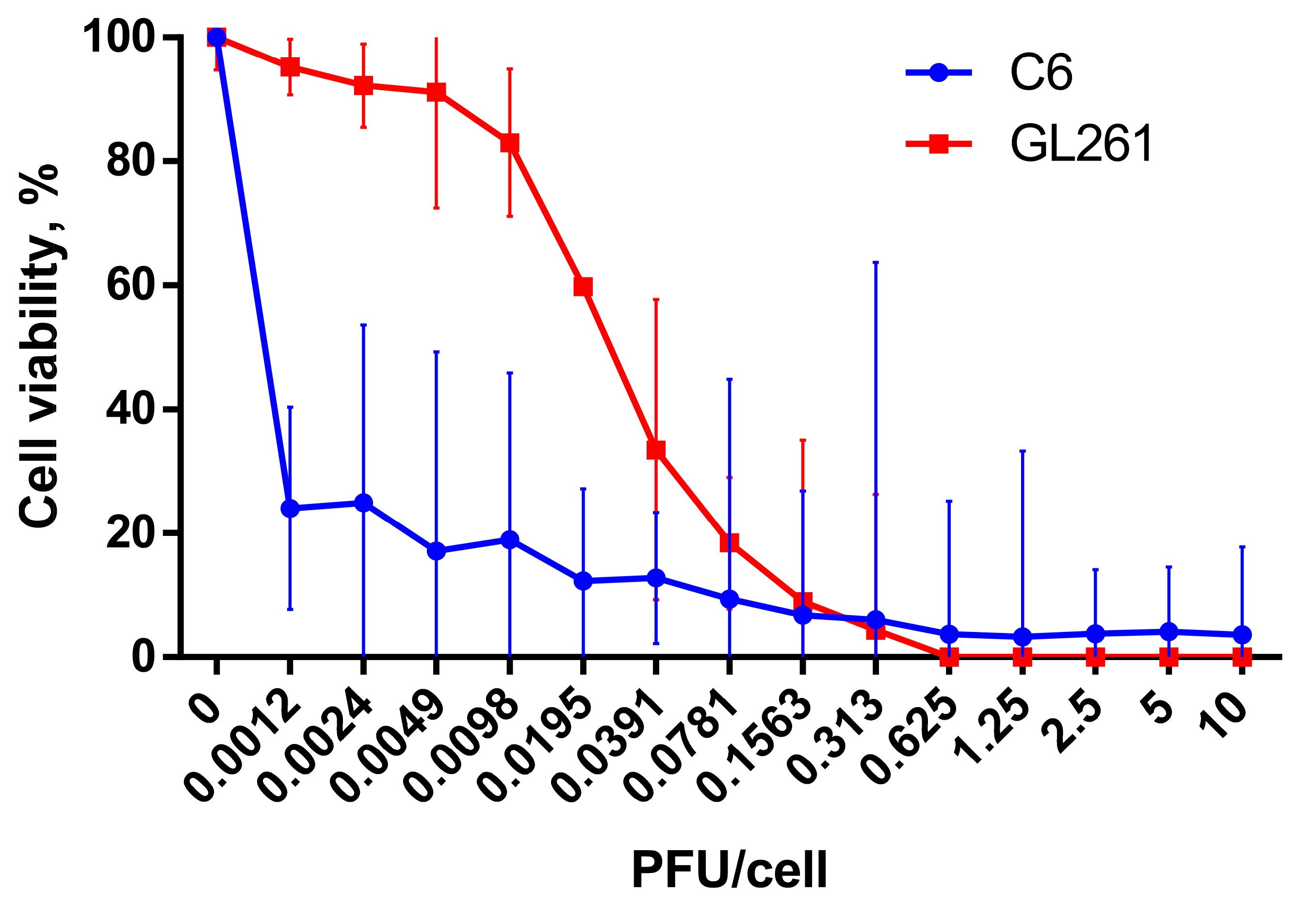 The cytotoxic VV-GMCSF-Lact activity against rat C6 and mouse GL261 glioma cells was performed using the standard MTT test. For this, cells were seeded into 96-well culture plates (TPP, Switzerland) in an amount of 4000 cells per well.