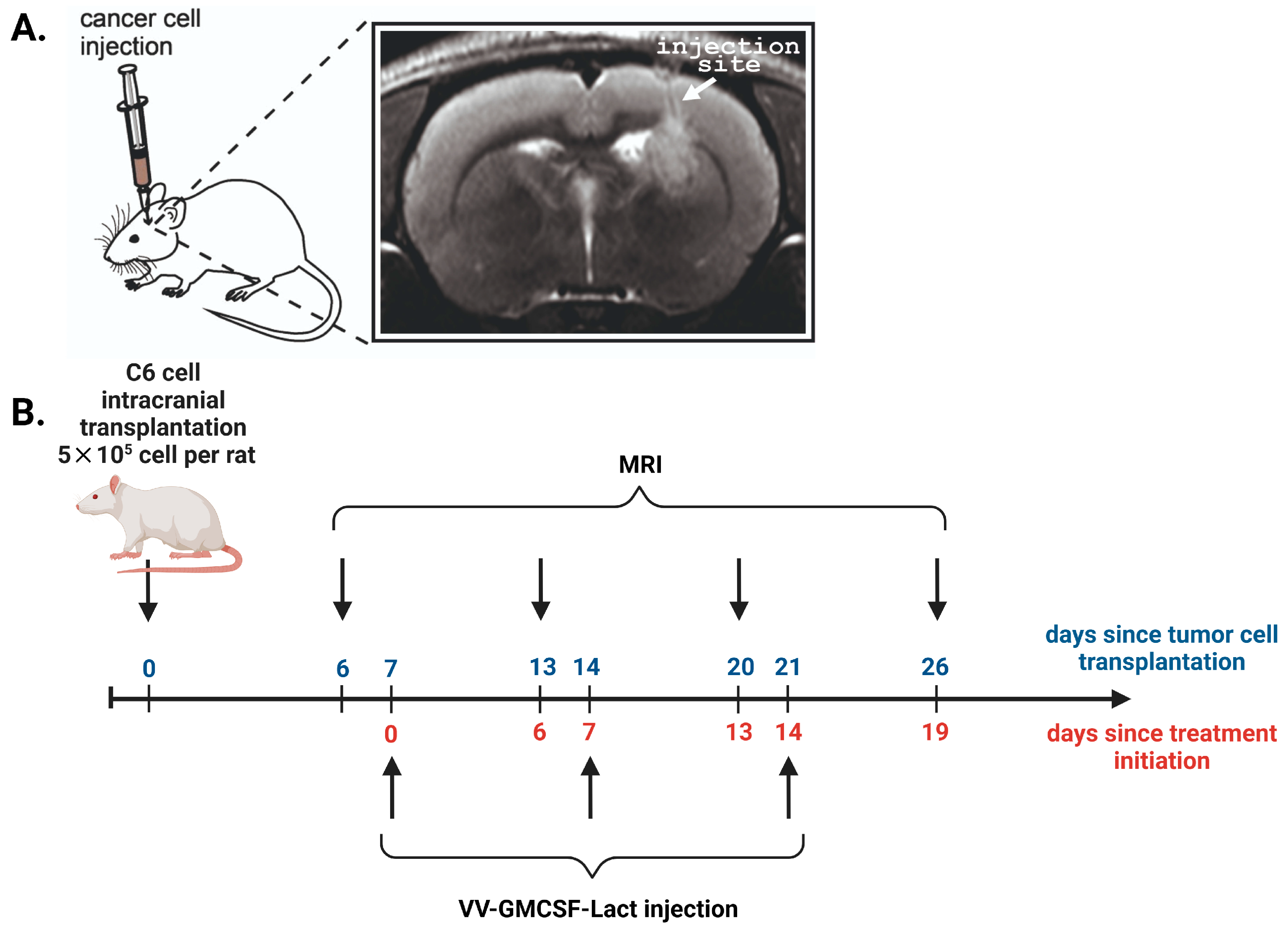 To evaluate VV-GMCSF-Lact efficacy, tumor size, mean survival time, and increase in lifespan were estimated.