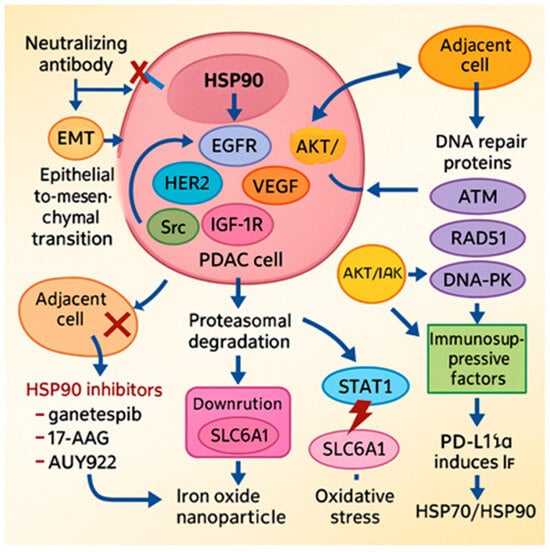 Lastly, iron oxide nanoparticles (DIO-NPs) have been shown to trigger oxidative stress in PDAC cells, leading to upregulation of HSP70 and HSP90 as part of a cytoprotective response. This stress adaptation can be effectively counteracted by co-treatment with HSP inhibitors, thereby amplifying the overall antitumor effect both in vitro and in vivo []. Figure 3 presents a summary of the role of the HSP90 in PDAC.