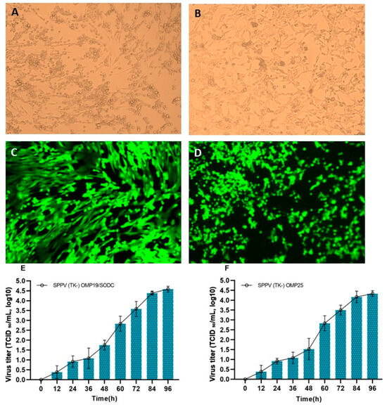 Vero cells were cultured in flasks, and their attachment and growth were monitored by light microscopy. Cells were seeded at a density of 1.5 × 107 cells/mL. The results showed that Vero cells began to adhere to the flask surface within 6–8 h post-seeding, and by 24 h, the surface was fully covered. The cultured Vero cells were then infected with recombinant SPPV(TK-)-OMP19/SODC or SPPV(TK-)-OMP25 at a dose of 0.1 TCID50/well. On day 4 post-infection, when 80–90% of the cell monolayer was affected by the recombinant viruses (Figure 1A,B), viral suspensions were collected. GFP expression was observed in control cells infected with a GFP-expressing SPPV construct (Figure 1C,D), confirming that the infection and replication processes were functional. At this point, the maximum mean titers of SPPV(TK-)-OMP19/SODC and SPPV(TK-)-OMP25 reached 4.67 ± 0.08 log10 TCID50/mL and 4.33 ± 0.17 log10 TCID50/mL, respectively (Figure 1E,F).