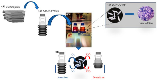 Schematic representation of the BelloStage™-3000 bioreactor system. The system was placed in a 37 °C, 5% CO2 incubator. The process began with the preparation and dissociation of Vero cells in OptiPRO™ SFM medium (A). The prepared cell suspensions were seeded into BelloCell™ 500A flasks containing BioNOC II® macrocarriers (B). After the initial attachment phase, additional medium was added, and the flasks were transferred to the bioreactor (C). Cyclic up-and-down movement of the platform facilitated nutrient and O2/CO2 exchange (D), creating optimal conditions for Vero cells and subsequent virus replication (E).
