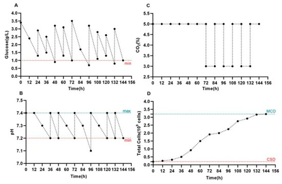 Monitoring of metabolic parameters and Vero cell growth in the BelloStage™-3000 system. Dynamics of glucose (A), pH (B), and CO2 (C) during Vero cell cultivation in the BelloStage™-3000 system with BioNOC II® macrocarriers. (D) Cell growth kinetics are shown at 12 h intervals. (max/min). The upper and lower tolerance limits are indicated by the blue and red dotted lines, respectively. (MCD) Maximum cell density. (CSD) Cell seeding density.