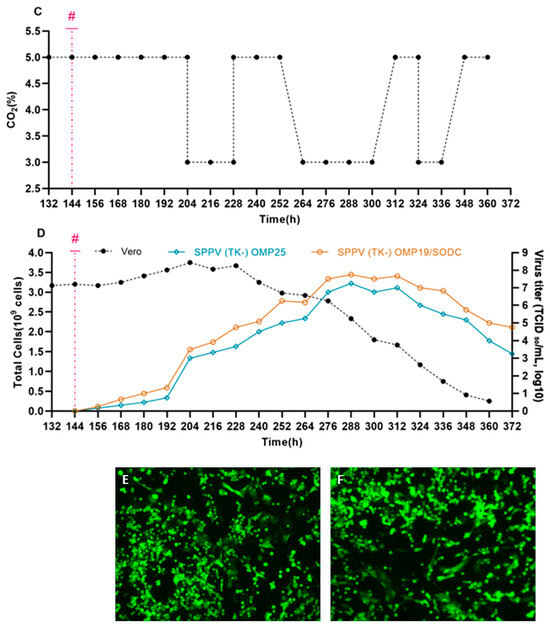 On day 6 after seeding, Vero cells were inoculated with recombinant capripoxviruses (SPPV (TK-) OMP19/SODC or SPPV (TK-) OMP25) at a dose of 0.1 TCID50/well. At the time of inoculation and every 48 h thereafter, the culture medium was replaced with fresh medium, and the viral suspension was collected simultaneously. The glucose concentration and pH in the culture medium were monitored daily and adjusted when necessary to ensure stable conditions: glucose was maintained at ≥1.0 g/L (Figure 4A) and pH within the range of 7.2–7.4 (Figure 4B). The CO2 level was regulated according to the measured pH value (Figure 4C). Cell density was monitored every 12 h (Figure 4D).