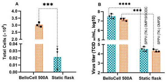 Comparative analysis of Vero cell proliferation and recombinant capripoxvirus titers in BelloCell 500A flasks and static culture flasks. (A) Total yields of Vero cells in BelloCell 500A compared to static flasks (*** p < 0.0001; n = 3). (B) Maximum titers of recombinant viruses SPPV (TK-) OMP19/SODC and SPPV (TK-) OMP25 in BelloCell 500A compared to static flasks (*** p < 0.0001, **** p < 0.001; n = 3).