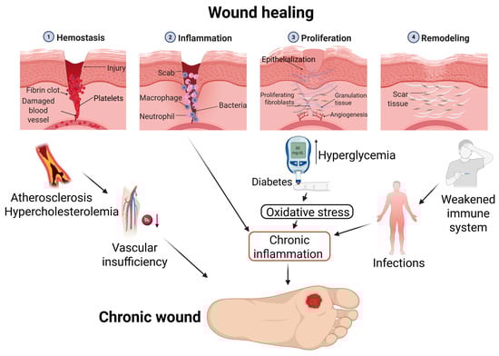 CWs are tissue injuries that do not progress through the standard stages of healing (hemostasis, inflammation, proliferation, remodeling) for 4–12 weeks despite treatment (Figure 1) [1]. They become stalled in the inflammatory phase, which prevents recovery. There are different causes and risk factors for CWs [2,3]. First of all, vascular insufficiency manifesting against the background of atherosclerosis and hypercholesterolemia is a powerful predictor of negative outcomes, because poor blood circulation prevents tissues from getting enough nutrients [4,5] and oxygen. High sugar levels in people with diabetes also damage blood vessels, which affects the tissue supply system [6]. Hyperglycemia inhibits the activity of antimicrobial peptides, such as cathelicidin [7], disrupts the barrier function of the skin, and promotes the formation of biofilms and pressure injuries [8]. In patients with limited mobility, the risk of adverse outcomes increases. A weakened immune system also increases the risk of delayed healing or wound infection. Infections and antibiotic resistance contribute to the formation of CW [9]. Additionally, the alkaline environment of wounds (for example, in diabetes) retards healing [10].