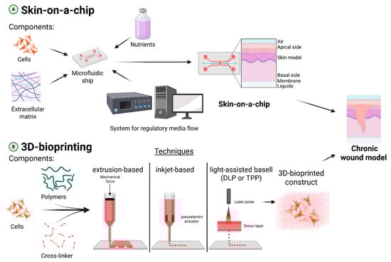 Advanced engineered models for chronic wound research. (A) Skin-on-a-Chip: This microphysiological system integrates human-derived cells, ECM components, and a perfused circulatory system within a microfluidic chip. It accurately mimics key aspects of skin physiology and the wound microenvironment. The dynamic flow of nutrients and biochemical factors allows for real-time, high-resolution analysis of cell-cell interactions, host-microbiome crosstalk, and drug responses under physiologically relevant conditions. (B) 3D Bioprinting: These techniques enable the construction of sophisticated, multi-cellular wound models with high architectural precision. Extrusion-based bioprinting employs mechanical pressure to continuously deposit bioink filaments, making it ideal for creating large, structurally robust constructs. Inkjet-based bioprinting utilizes thermal or acoustic forces to eject picoliter droplets of bioink, enabling high-speed printing for rapid prototyping. Light-assisted bioprinting (e.g., DLP/TPP) uses projected light patterns to photopolymerize photosensitive bioinks in a layer-by-layer fashion, achieving the highest resolution for complex microarchitectures. Collectively, these technologies enable the production of more realistic models of wound healing.