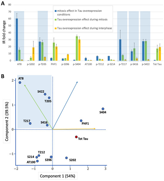Overall, Principal Component Analysis using the three variables from Table 1 identified the mitotic phospho-epitope cluster, characterized by high values for Component 2 (driven by the two mitosis-related variables) and low values for Component 1 (primarily influenced by interphase overexpression effects) (Figure 3B). This cluster contains AT8, p-T205 (part of the AT8 epitope), p-T217, p-S416, and p-S422 as Tau epitopes highly and specifically phosphorylated during mitosis (Figure 3A,B).