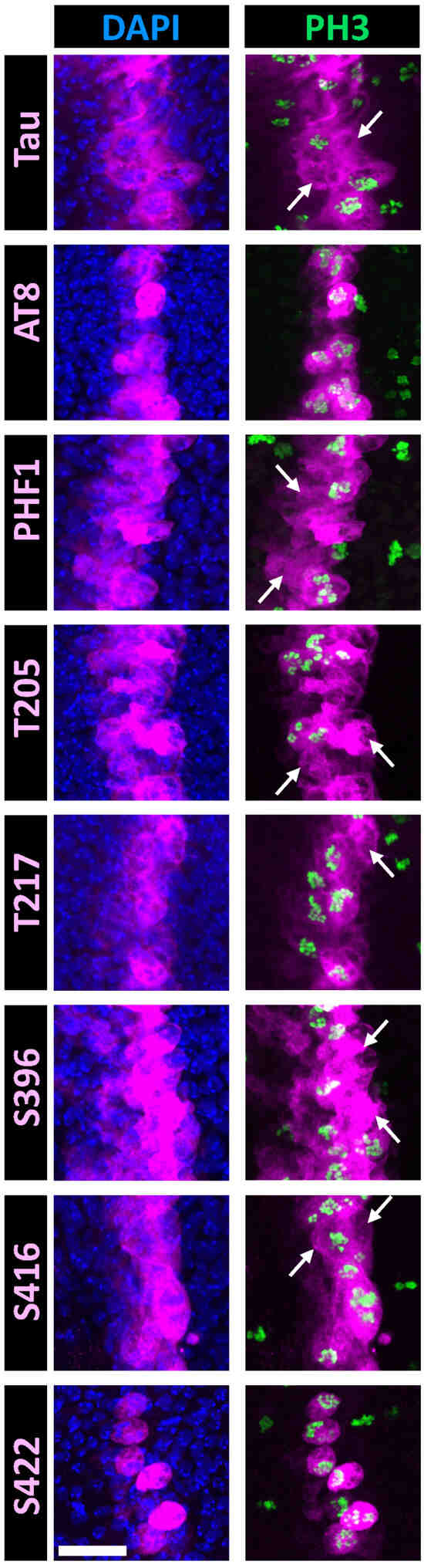 Double immunostaining of selected Tau phospho-epitopes with PH3 in the Drosophila wing disc at the third instar larval stage. Confocal images of a band of cells overexpressing human hTau in the Drosophila wing disc. Staining for total Tau is shown in the upper row (magenta), while staining for Tau phospho-epitopes is displayed in the lower rows (magenta). Nuclei are labeled with DAPI (blue, left column), and mitotic cells are identified by PH3 labeling (green, right column). Total Tau staining reveals that hTau is expressed within a 3–4 cell-wide band in the wing disc, consistent with the ptc-Gal4 expression pattern at this developmental stage. Since mitosis occurs asynchronously throughout the disc, PH3-positive mitotic cells are visible both within and outside the Tau-overexpressing region. In this analysis, we focused on the Tau-overexpressing area to examine the concordance between PH3 and phospho-Tau labeling. Arrows indicate interphase cells labeled for total Tau or phospho-Tau. Numerous interphase cells are observed for PHF1, p-T205, and p-S416 staining; fewer are detected for p-T217; and none are present for AT8 or p-S422 staining. Scale bar is 20 µm.
