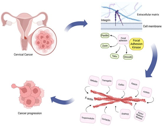 The multidimensional interaction of integrins, FAs, FAK, and ABPs creates a continuous signaling chain—from signal reception from the ECM, through its transduction, to a tangible outcome such as cell migration or invasion. Dysfunction of any element of this complex puzzle can lead to exacerbation of neoplastic features and, consequently, accelerated cancer progression. This general mechanism is conserved across multiple types of cancer, including CC.