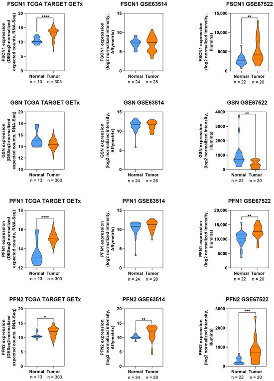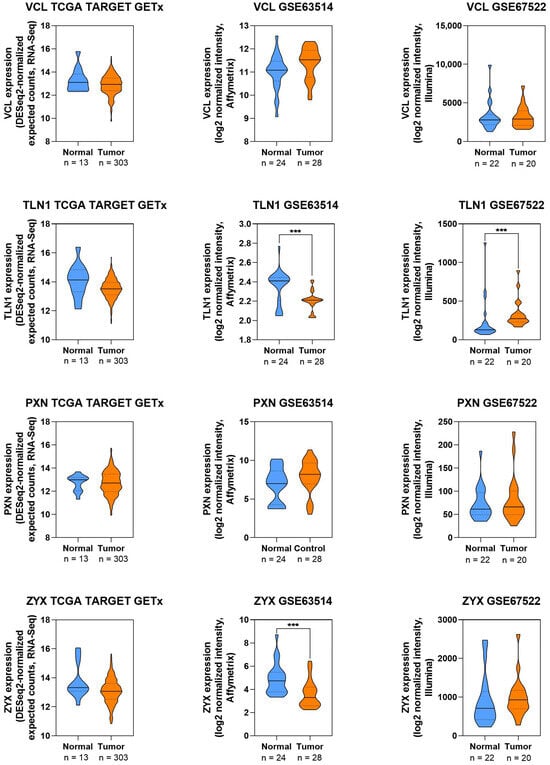To complement these findings, publicly available transcriptomic datasets were examined to map the expression patterns of selected FA genes (VCL, TLN1, PXN, and ZYX) in normal and cancer samples (Figure 4). The comparative analysis revealed that TLN1 and ZYX expression were significantly decreased in CC tissues in independent cohorts. For VCL and PXN, the observed differences were less pronounced and dataset dependent. These differences may be due to the available dataset size and the chosen platform. Nevertheless, the results suggest the clinical relevance of selected proteins, highlighting their role in altering CC cell adhesion (Figure 4).